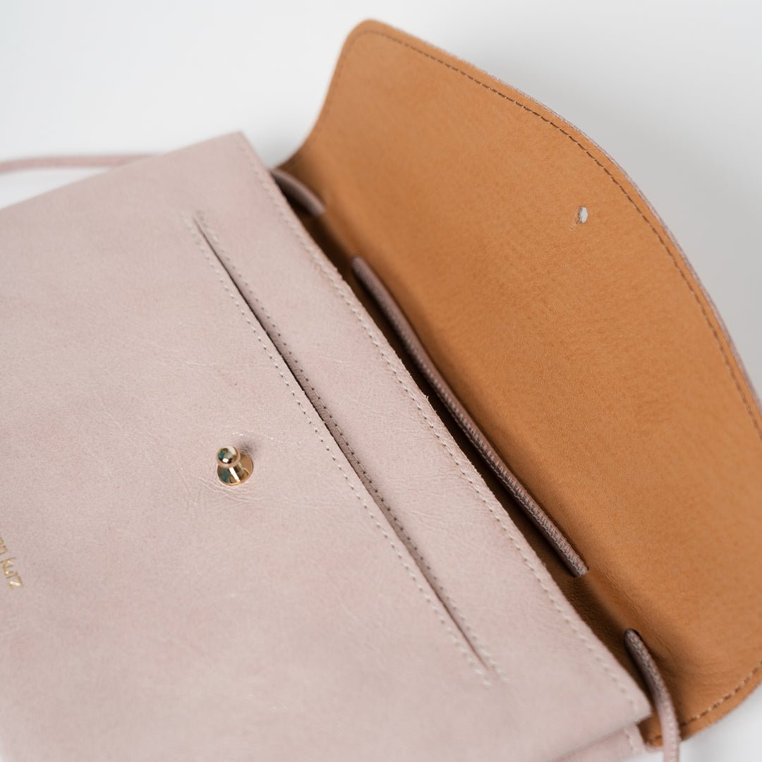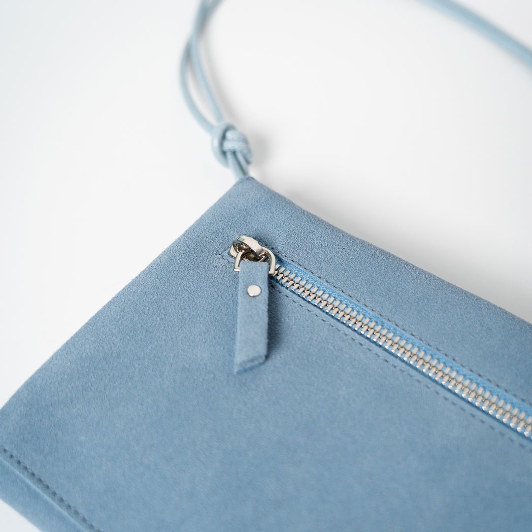 A recycled suede leather clutch with a compact design. It features adjustable handles, allowing you to wear it crossbody or hang it over your shoulder.
