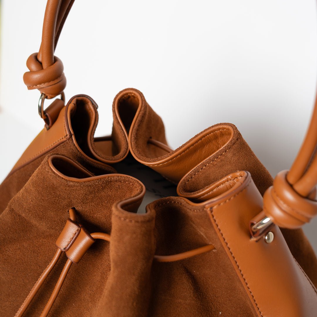 Leather bag in brown. It can be worn as a backpack, crossbody, over the shoulder, or carried by hand. An additional longer strap is included inside.
