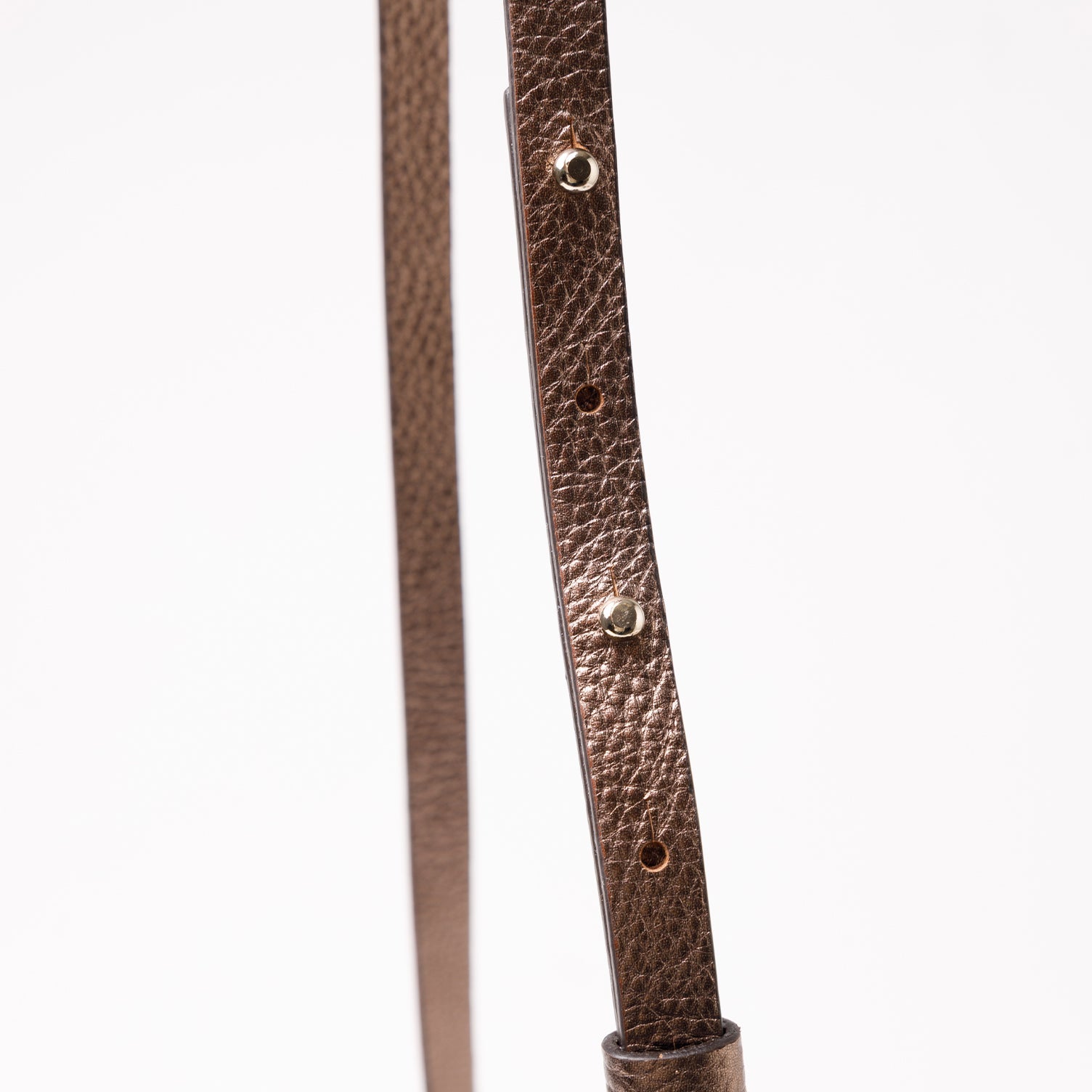 A metallic gold leather clutch with a compact design. It features adjustable handles, allowing you to wear it crossbody or hang it over your shoulder.
