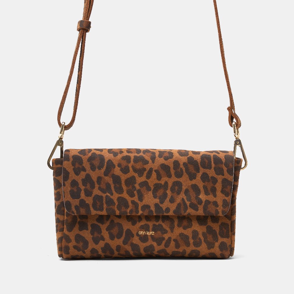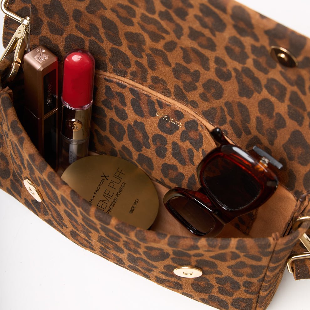 This compact leo print leather shoulder bag stands out for its sleek design and flap closure with two interior magnets. It features a small inner pocket and an engraved logo on the outside. It can be paired with either the black or champagne metallic chain.